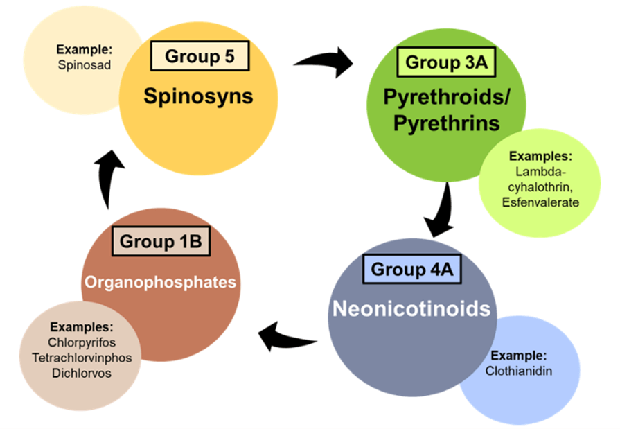 When insecticides are necessary there are several formulations and active ingredients available in the market, so it can be difficult to know which product to choose and how best to use it. Insecticides are classified based on their mode of action (MoA), or how the active ingredient works to kill an insect. Relying on a single mode of action for extended periods can lead to resistance. As insects develop resistance to an active ingredient, the product may appear less effective as tolerant insects survive. By using multiple modes of action in rotation or combination, we can combat the development of resistance.