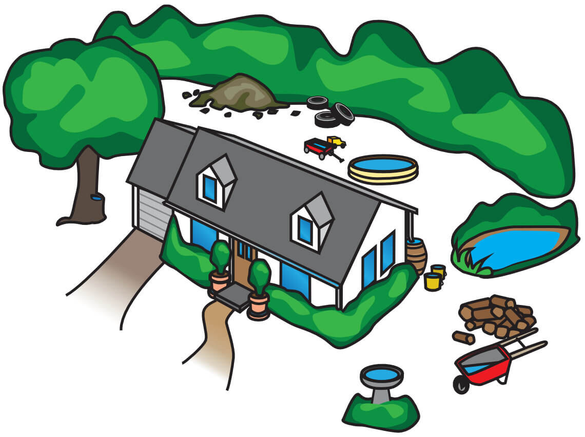 Dump water from equipment or buckets. Be on the lookout for any items or equipment covered with tarps. Tarps are particularly good at collecting water.